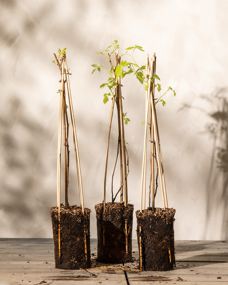Eine Himbeere Trio mit mehreren grünen Stängeln steht in einem schlichten weißen Topf auf einer hölzernen Unterlage vor einer hellbeigen, strukturierten Wand.