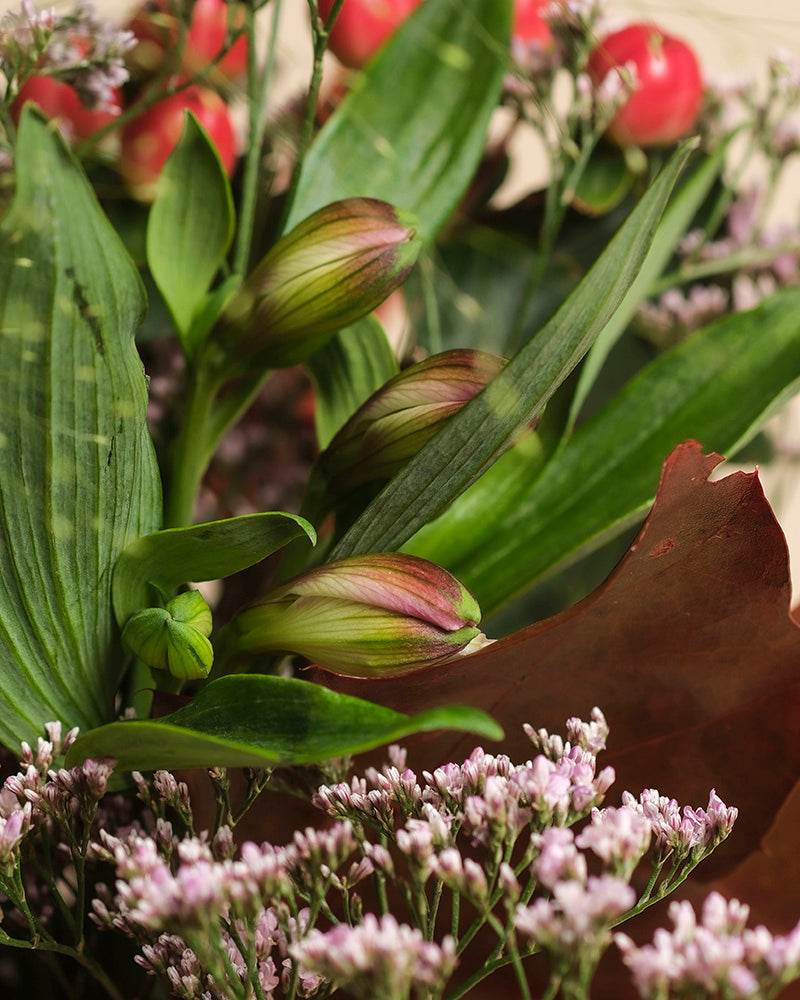 Nahaufnahme des Straußes Herbstfreude in warmen Tönen: geschlossene rosa Lilien, üppige grüne Blätter, zarte kleine rosa Blüten und rote Beeren. Ein lebhaftes Farbenspiel unterstreicht die vielfältigen Texturen und reichen Farbtöne.