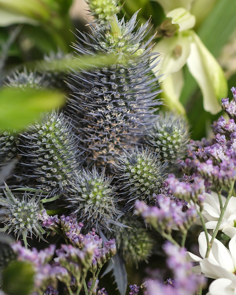Nahaufnahme der stacheligen blauen Distelblüten im Nebelmeer-Strauß, umgeben von zarten lila und weißen Blüten und grünen Blättern im Hintergrund.