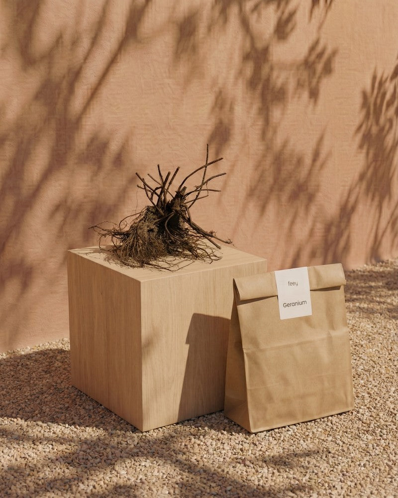 Eine getrocknete Geranienwurzel (blau) liegt auf einem Holzwürfel neben einer beschrifteten braunen Papiertüte. Beide Gartenschätze ruhen auf Kies mit sanftem Schatten, ideal für alle, die Rhizome einpflanzen wollen.