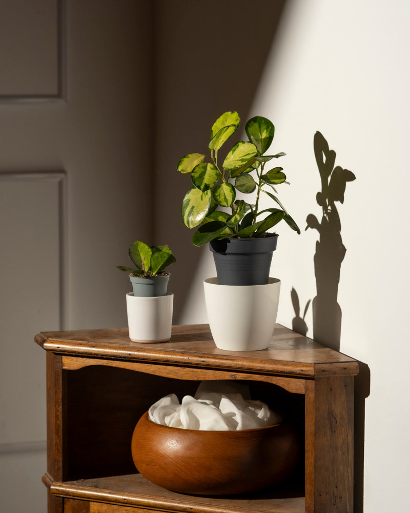 Ein Kunststoff-Topf (Kiki | 11 cm Ø) mit einer grünen Pflanze steht auf einem hölzernen Ecktisch, das Sonnenlicht wirft Schatten auf eine weiße Wand. Eine Holzschale mit weißen Servietten ist die perfekte Ergänzung für Zuhause Deko.