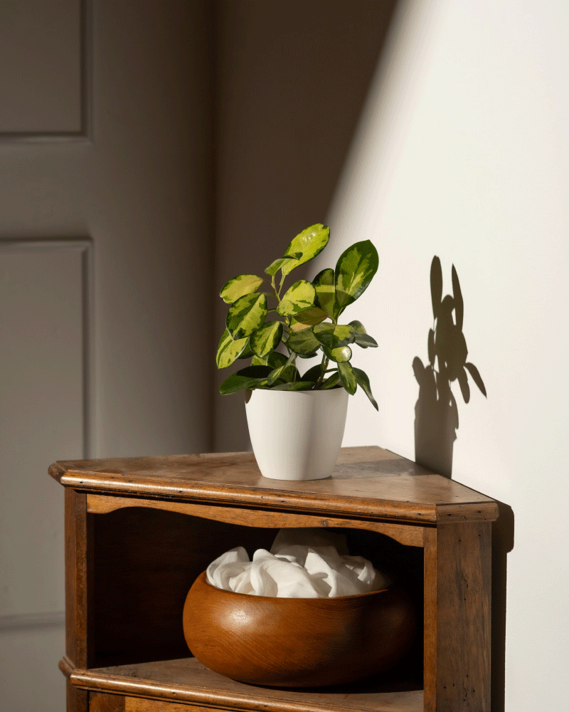 Ein Kunststoff-Topf (Kiki | 11 cm Ø) mit bunten grünen Blättern steht auf einem hölzernen Eckregal, das Sonnenlicht wirft Schatten auf eine weiße Wand. Darunter bringt eine runde Holzschale mit weißem Tuch Charme in Ihre Zuhause Deko.