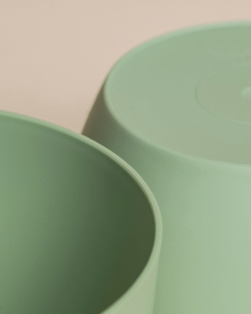 Nahaufnahme von zwei hellgrünen Kunststoff-Topf (Kiki | 11 cm Ø) Behältern, einer aufrecht und einer auf dem Kopf stehend, die einen minimalen Deko-Akzent vor einem beigen Hintergrund bilden.