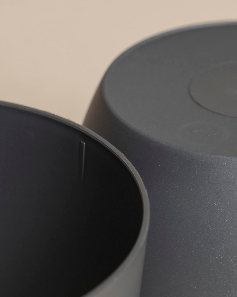 Nahaufnahme von zwei mattschwarzen zylindrischen Pflanzgefäßen aus Kunststoff-Topf (Kiki | 11 cm Ø), von denen eines aufrecht steht und eines auf der Seite liegt, ideal für die Heimdekoration, vor einem neutralen beigen Hintergrund.