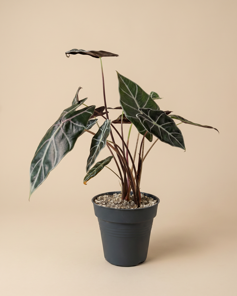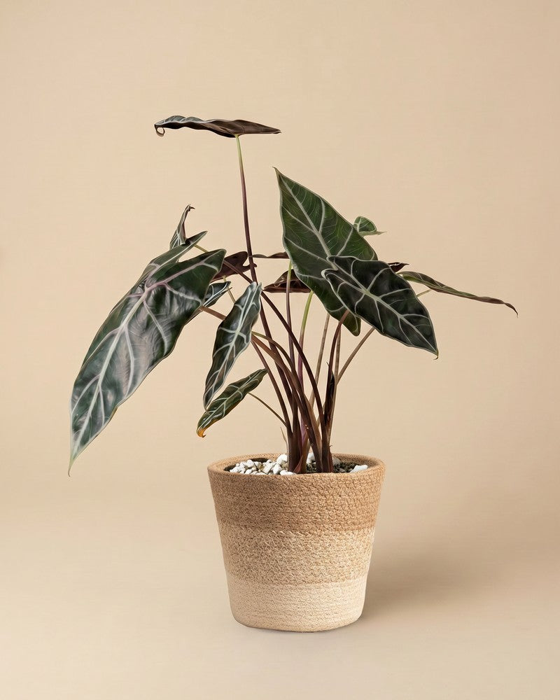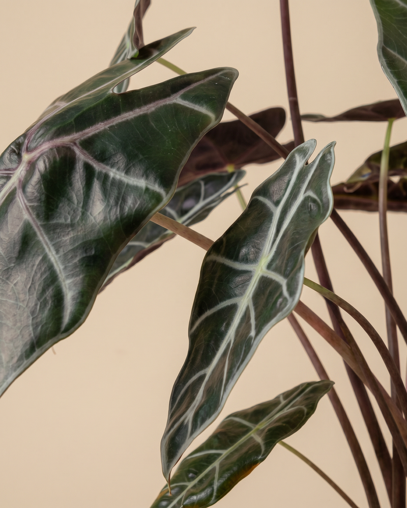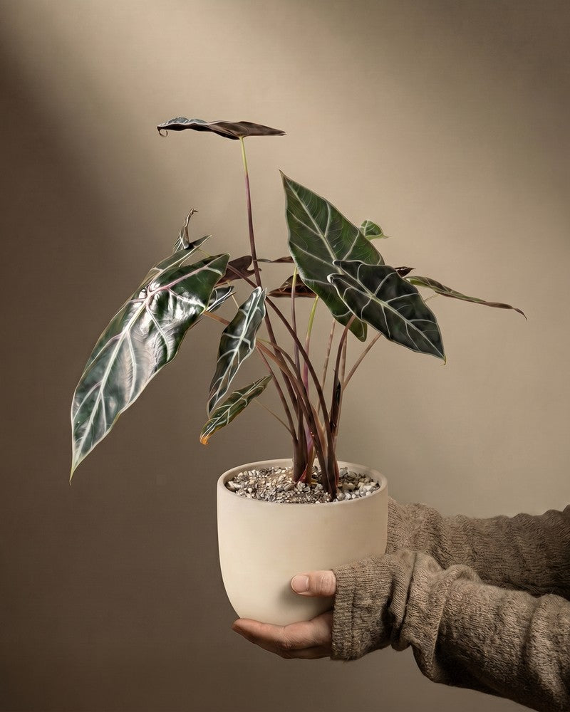 Dunkel, edel, unwiderstehlich. đ€ Die Alocasia 'Red Vein' beeindruckt mit fast schwarzen BlĂ€ttern und auffĂ€lligen hellen Adern. Sie ist ein echter Hingucker fĂŒr alle, die es dramatisch mögen. Als seltene Zimmerpflanze aus der Schweiz macht sie dein Zuhause zum Statement. âïžđ±
