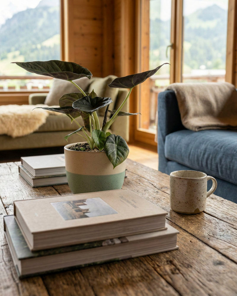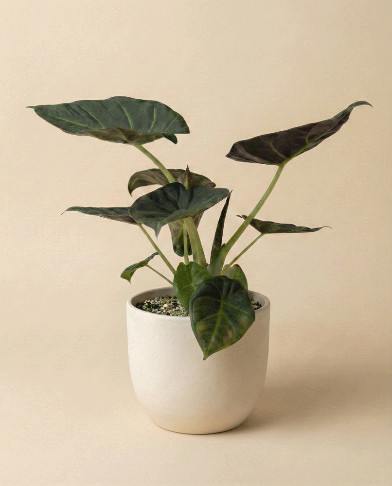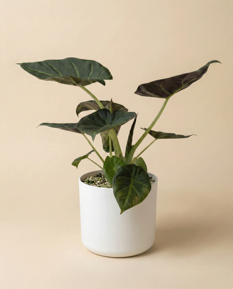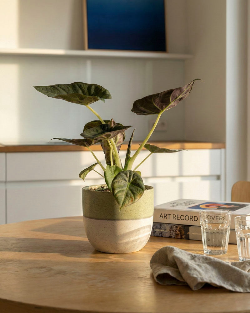 Deine Alocasia mag einen hellen bis halbschattigen Standort ohne pralle Sonne. Sie liebt hohe Luftfeuchtigkeit, darum freut sie sich über ein helles Badezimmer.