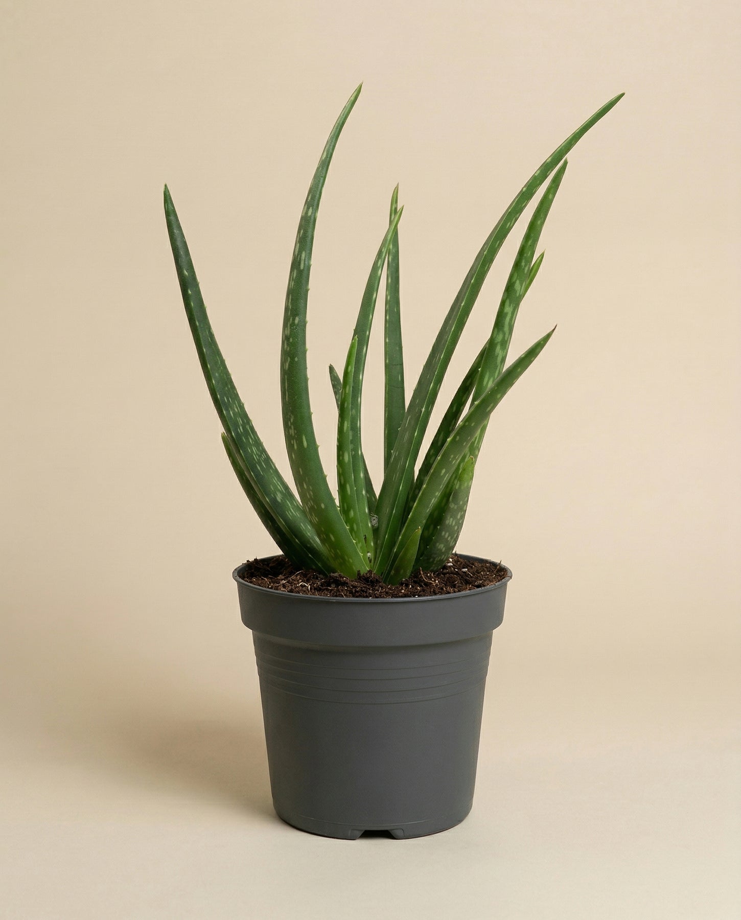 Eine Echte Aloe, eine pflegeleichte Pflanze mit langen, spitzen Blättern, steht in einem dunkelgrauen Kunststofftopf vor schlicht beigem Hintergrund.
