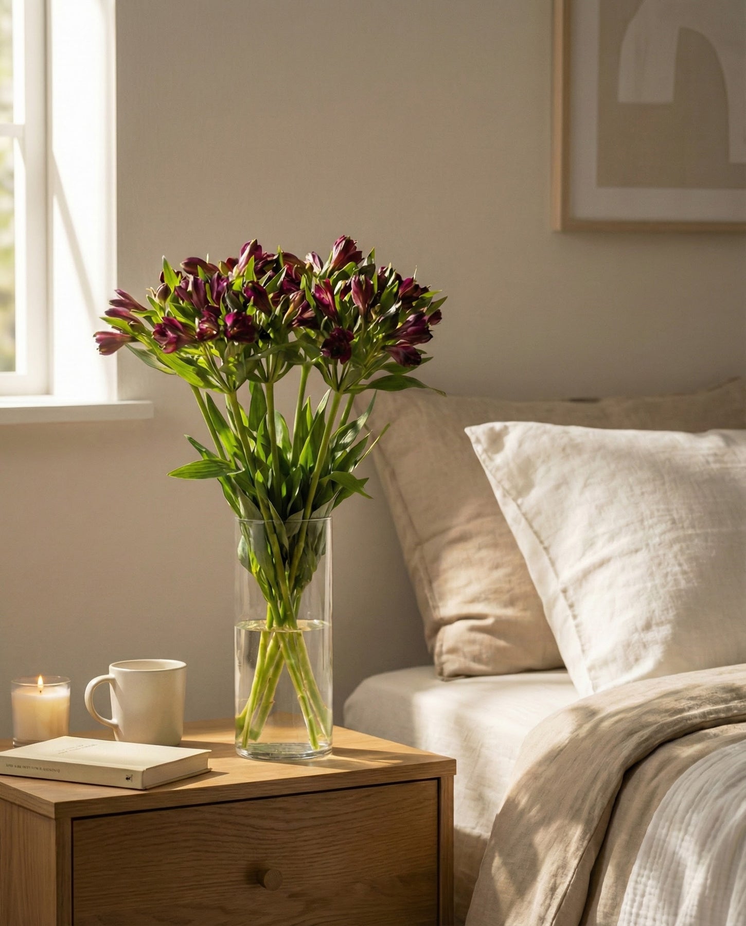 Auf einem hölzernen Nachttisch steht eine gläserne Lieblingsvase, gefüllt mit Alstroemeria, neben einer brennenden Kerze, einer Kaffeetasse und einem geschlossenen Buch. Das Sonnenlicht fällt durch das Fenster auf ein ordentlich gemachtes Bett mit beiger Bettwäsche.