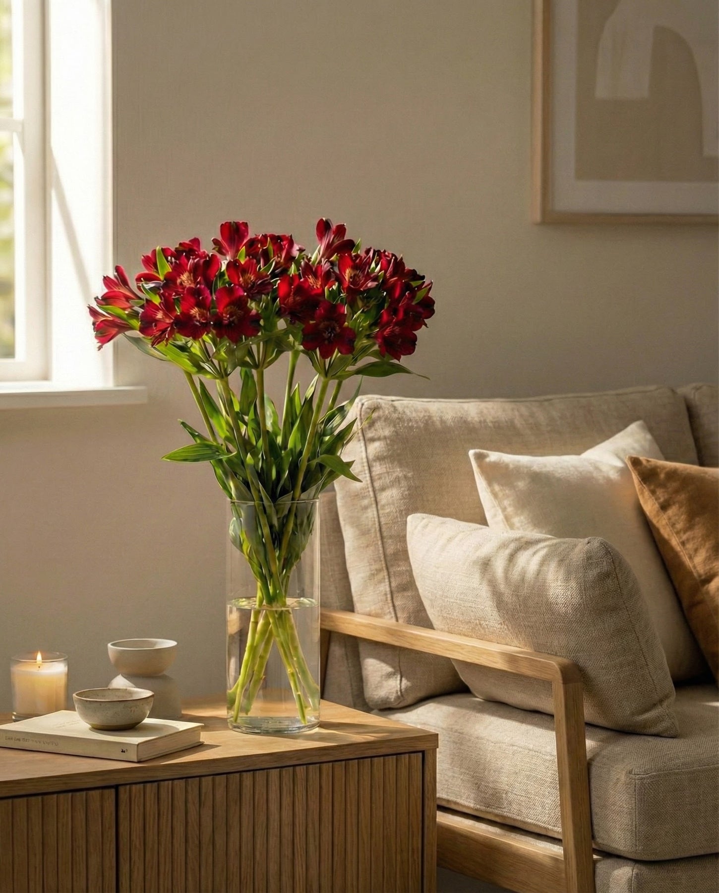 Eine gläserne Lieblingsvase mit Alstroemeria steht auf einem hölzernen Beistelltisch neben einem beigen Sofa mit braunen und weißen Kissen. Eine brennende Kerze und Tassen stehen auf dem Tisch, während das Sonnenlicht durch das nahe gelegene Fenster fällt.