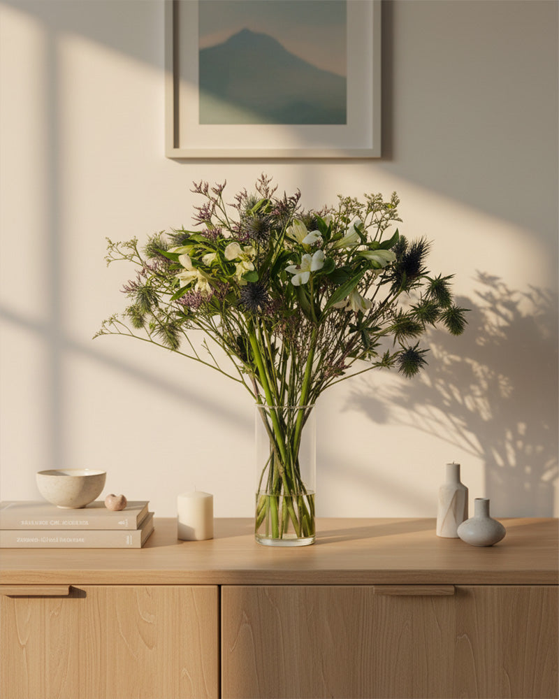 In einer klaren Glasvase steht der grün-weiße Wanderlust-Strauß und bringt Bergluft-Stimmung in einen hellen Holzschrank. In der Nähe liegen Bücher, Kerzen und kleine Vasen, während das Sonnenlicht sanfte Schatten unter die gerahmte Wandkunst wirft.