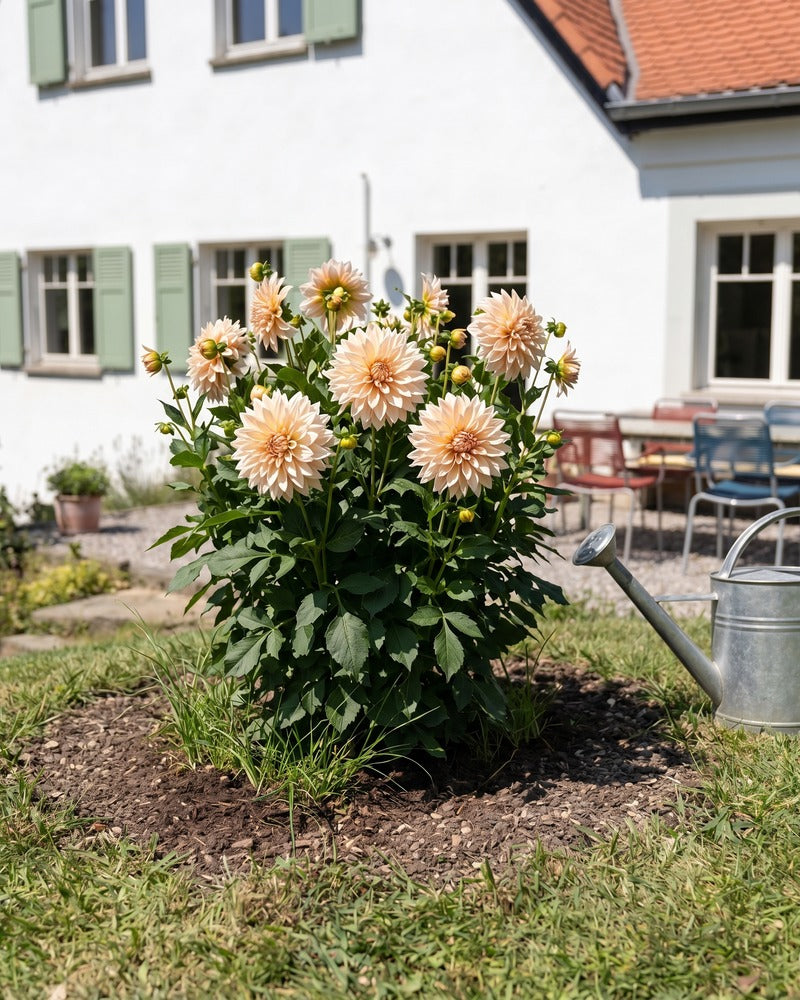 Beige Dahlie in voller Blüte im Gartenbeet vor einem Landhaus mit Zinkgiesskanne