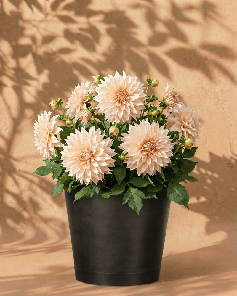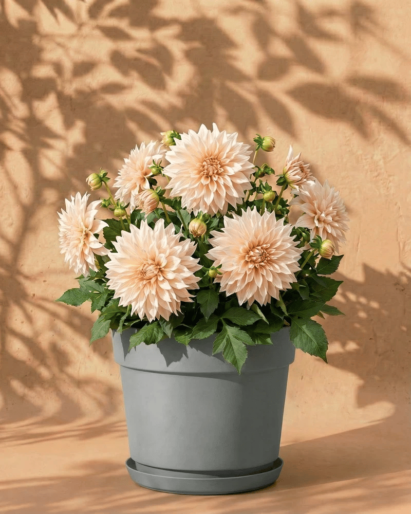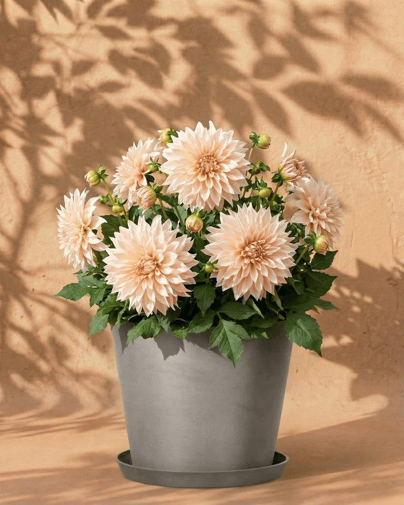 Beige Dahlie im dunkelgrauen Amsterdam-Übertopf mit Untersetzer vor warmer Wand