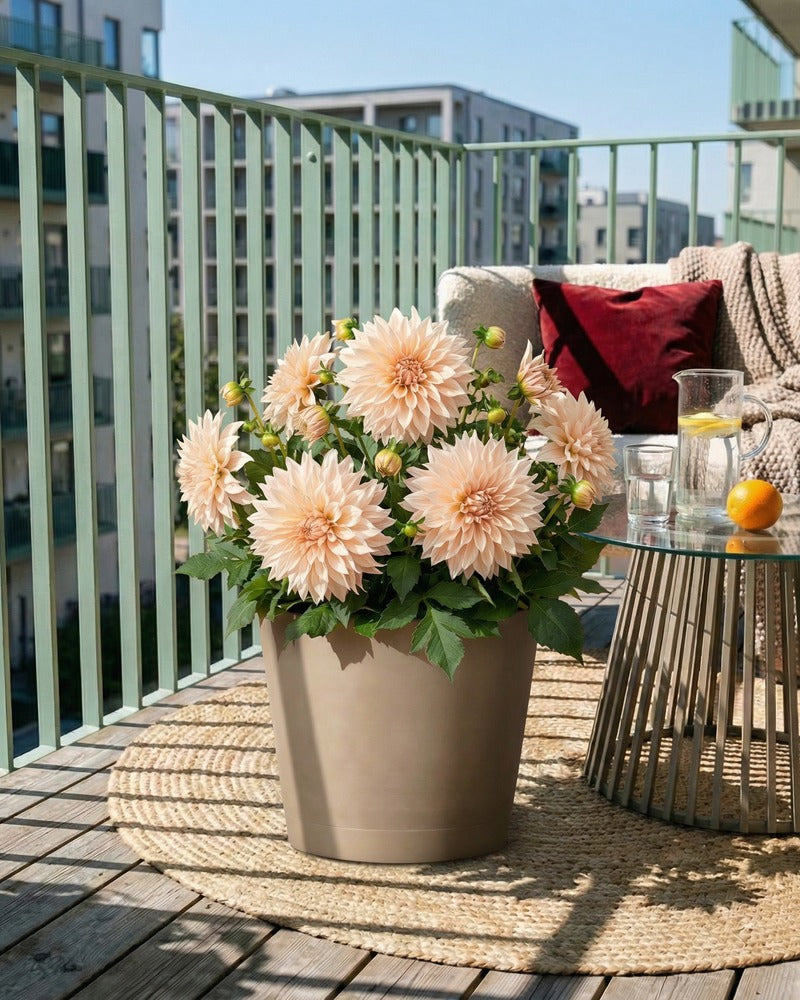 Beige Dahlie im beigen Topf auf einem sonnigen Balkon mit Lounge-Sofa