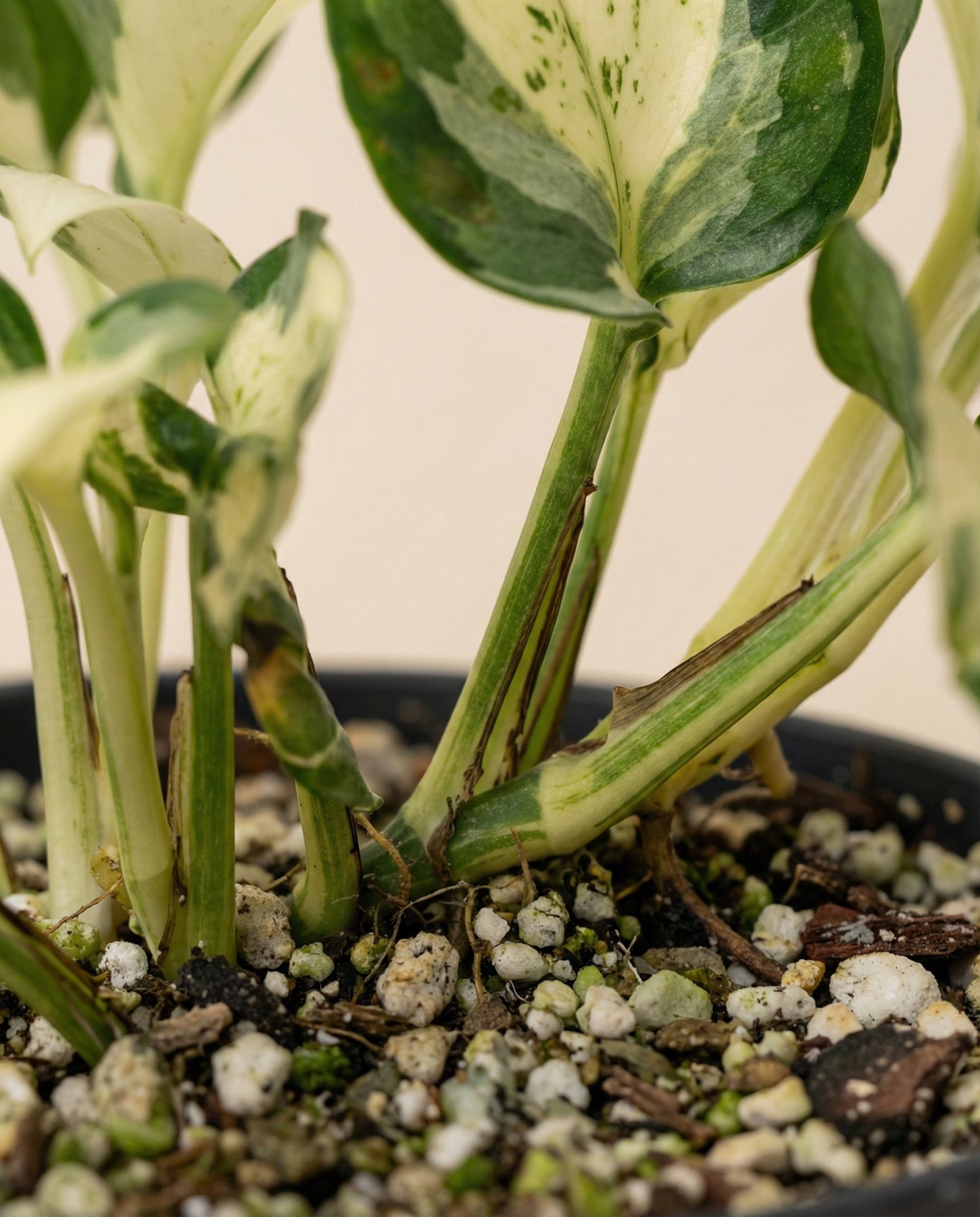 Nahaufnahme der Basis einer Monstera 'Cheesy' - feey in einem Topf, umgeben von einer Mischung aus Erde, kleinen Steinen und weißem Perlit.