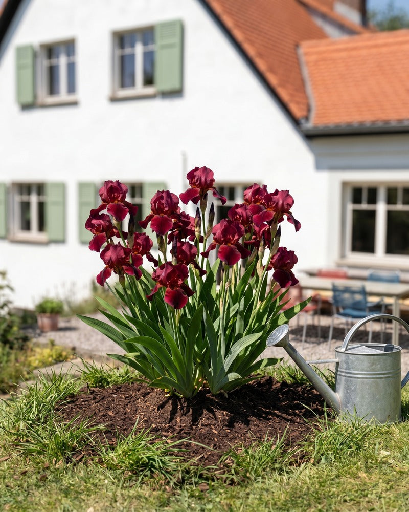Rote Iris in voller Blüte im Gartenbeet vor einem Landhaus mit Zinkgiesskanne