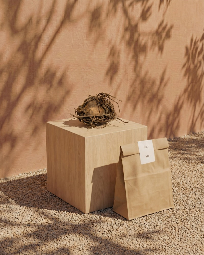 Iris-Rhizome und feey-Papiertüte auf einem Holzwürfel im warmen Sonnenlicht