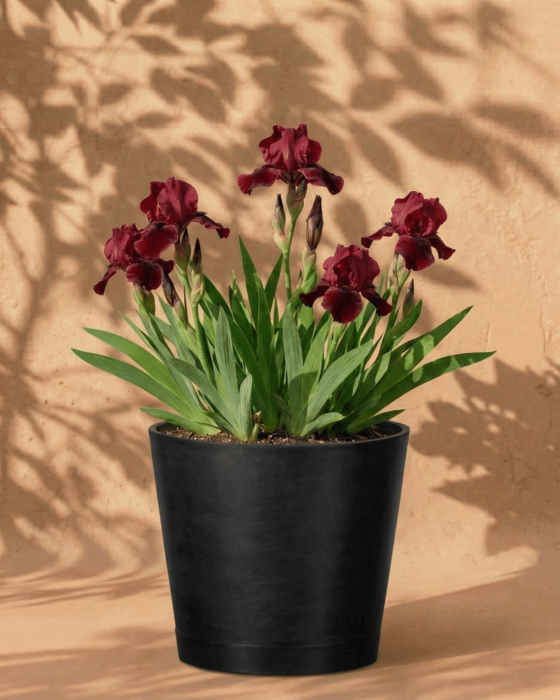 Rote Iris im anthrazitfarbenen Venice-Übertopf vor einer warmen Sandsteinwand