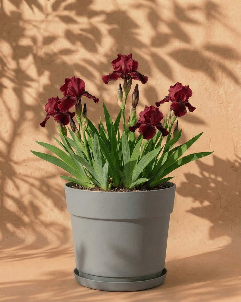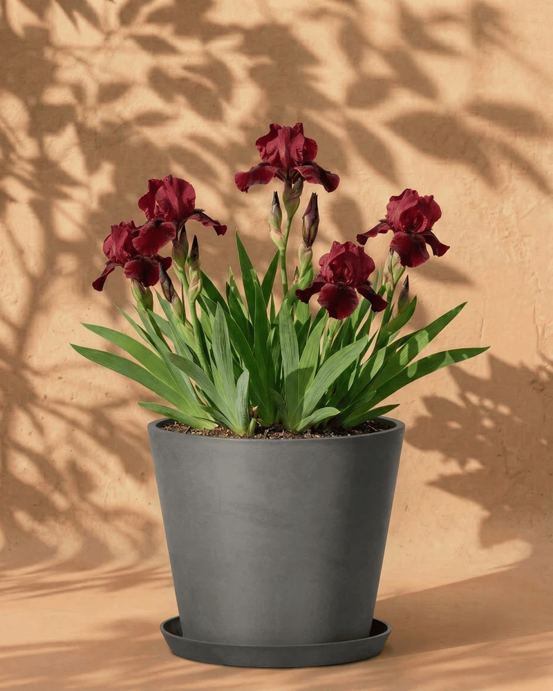 Rote Iris im dunkelgrauen Amsterdam-Übertopf mit Untersetzer vor warmer Wand