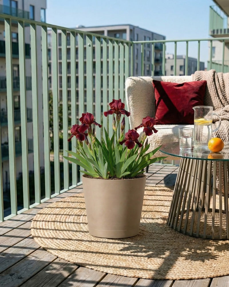 Rote Iris im beigen Topf auf einem sonnigen Balkon mit Lounge-Sofa