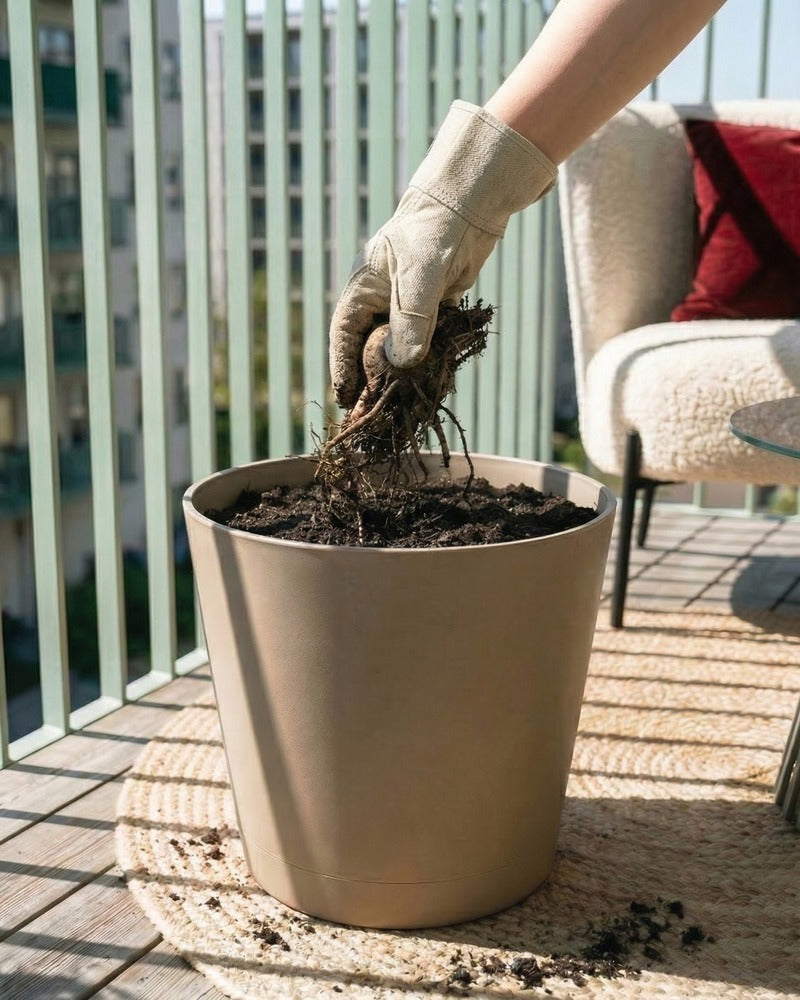 Hand pflanzt Iris-Rhizom in einen beigen Topf auf einem sonnigen Balkon