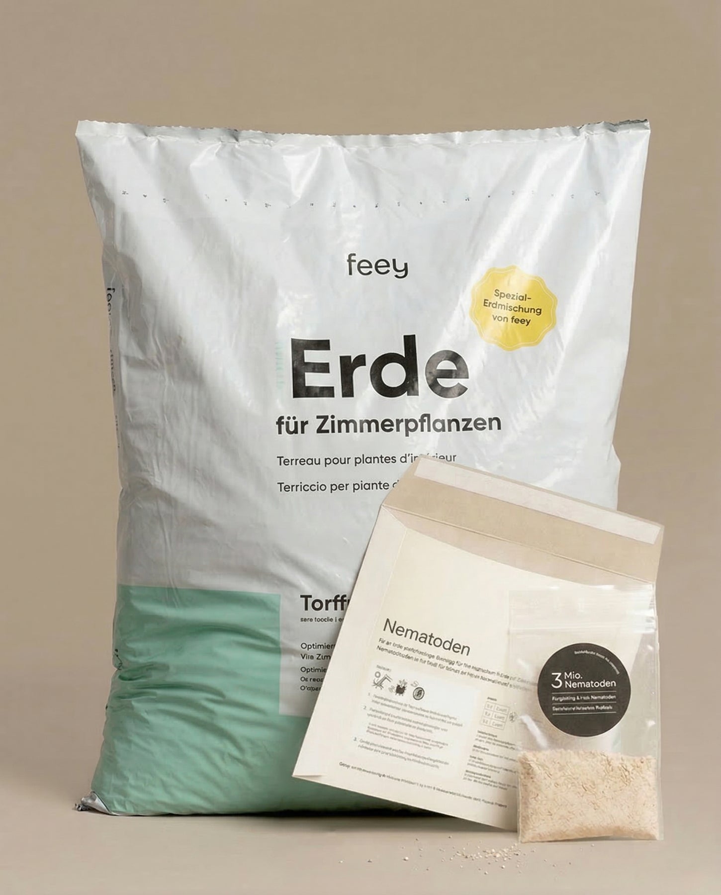 Topfe deine Zimmerpflanze in die frische Erde um. Danach vermischst du die Nematoden mit Wasser und giesst damit deine Pflanze. 💦 Genaue Anweisungen findest du auf den jeweiligen Verpackungen. 😉
