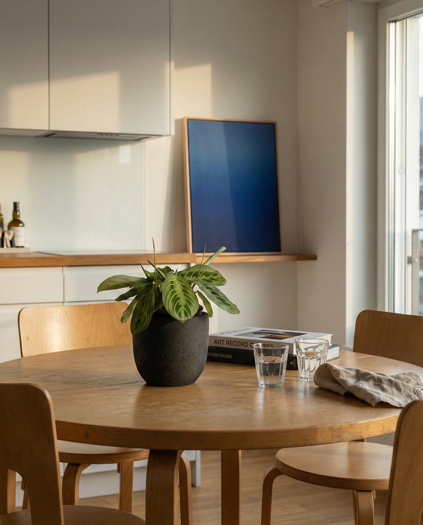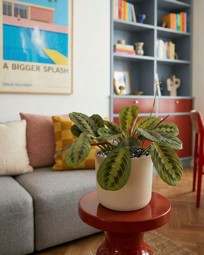 Platziere deine Maranta 'Fascinator' an einem hellen bis halbschattigen Standort, aber bitte ohne direktes Sonnenlicht. Da sie auch hohe Luftfeuchtigkeit benötigt, freut sie sich über ein helles Badezimmer.