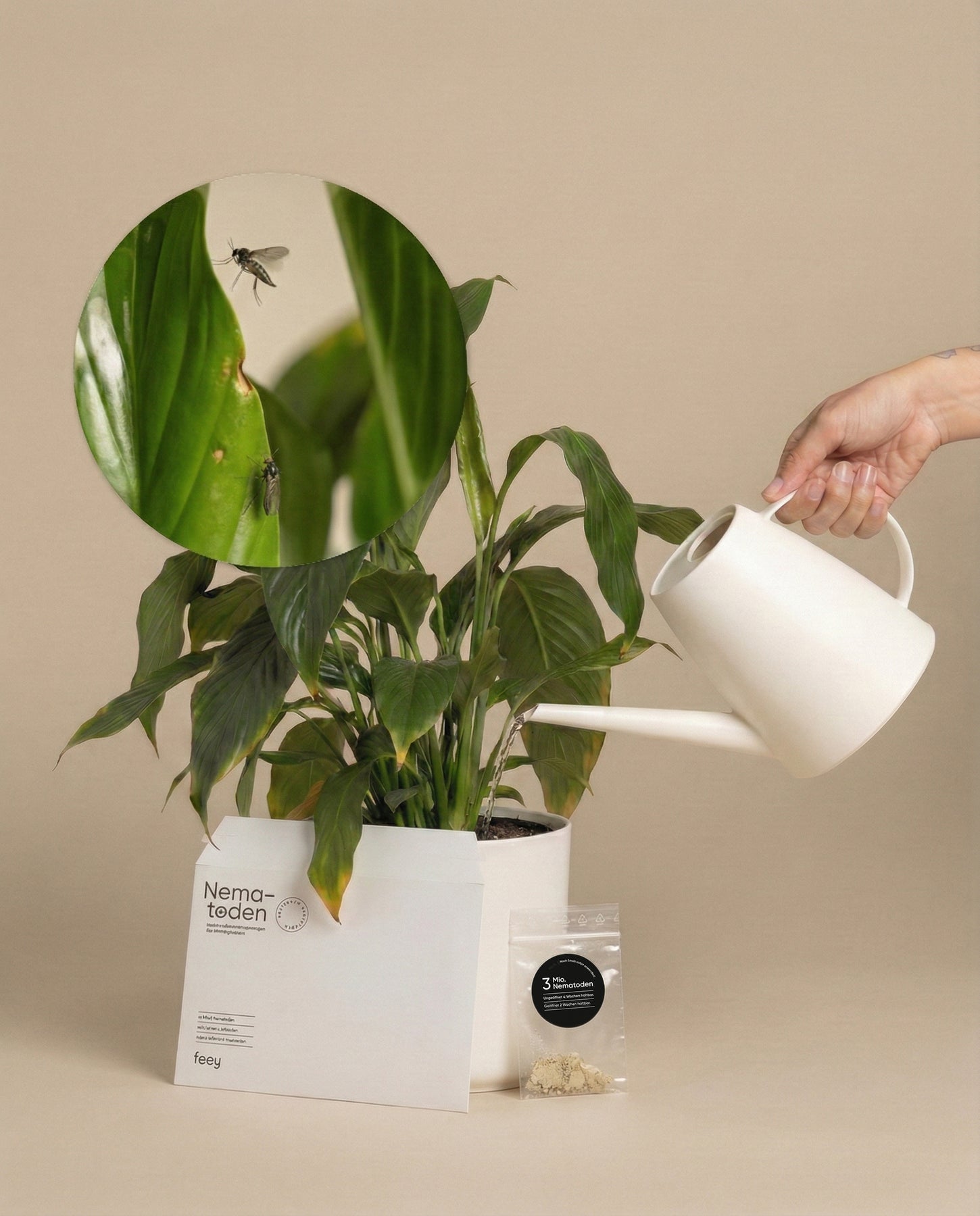 Eine Hand gießt eine getopfte Zimmerpflanze mit einer weißen Kanne. Eine Einlage zeigt Wanzen auf einem Blatt. In der Nähe befindet sich eine weiße Schachtel mit der Aufschrift "Nematoden gegen Trauermücken" und eine Saatgutpackung, die auf die Verwendung zur Behandlung von Pflanzenschädlingen und zur Bekämpfung von Trauermücken hinweist.