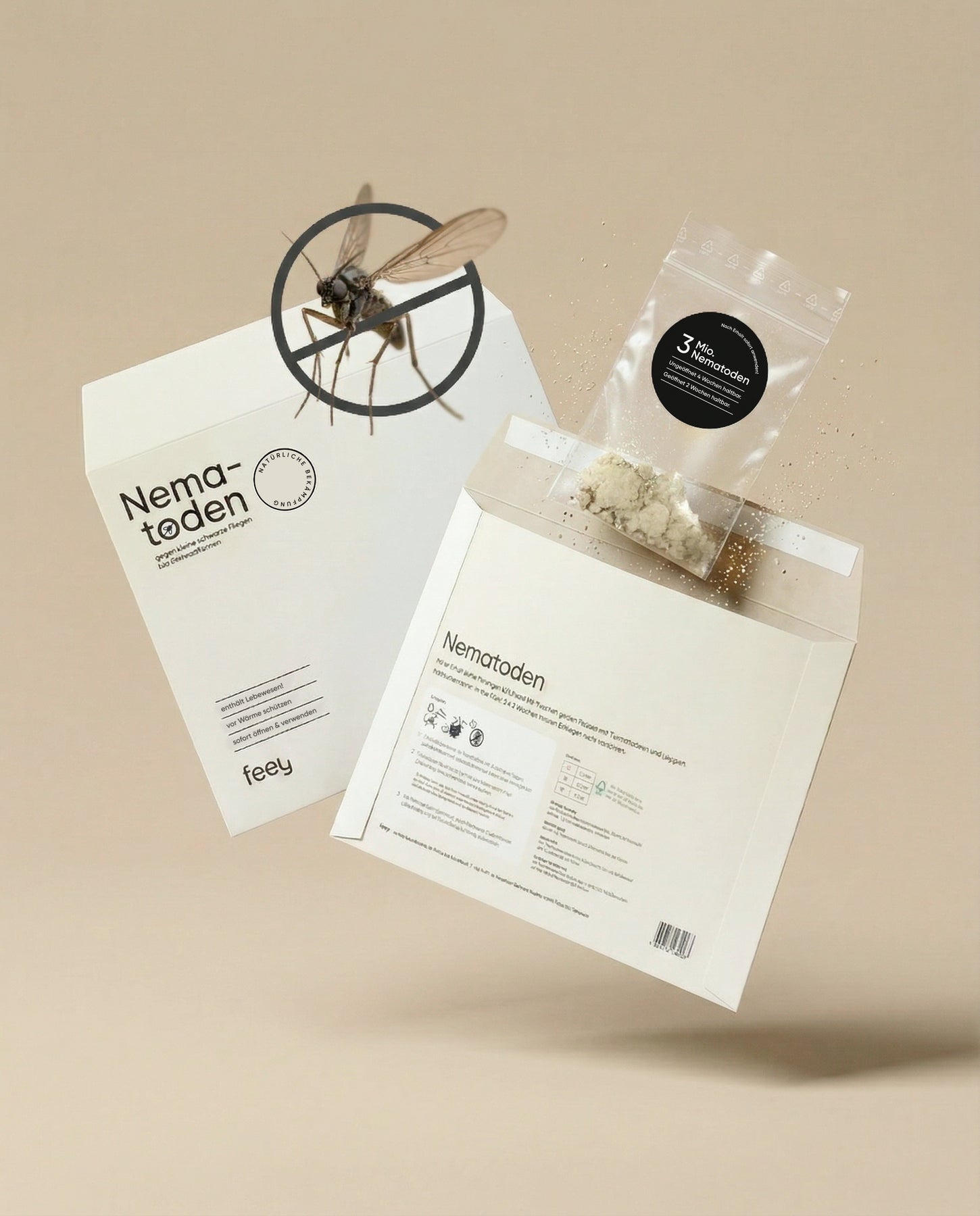 Auf einem beigen Hintergrund sind zwei Packungen "Nematoden gegen Trauermücken" zu sehen - eine geöffnet, das Pulver tritt aus -, die zur Bekämpfung von Trauermücken in Zimmerpflanzen verwendet werden. Außerdem sind eine Mücke mit einer Zielscheibe und eine durchsichtige Tüte mit der Aufschrift "3x Nematoden" zu sehen.