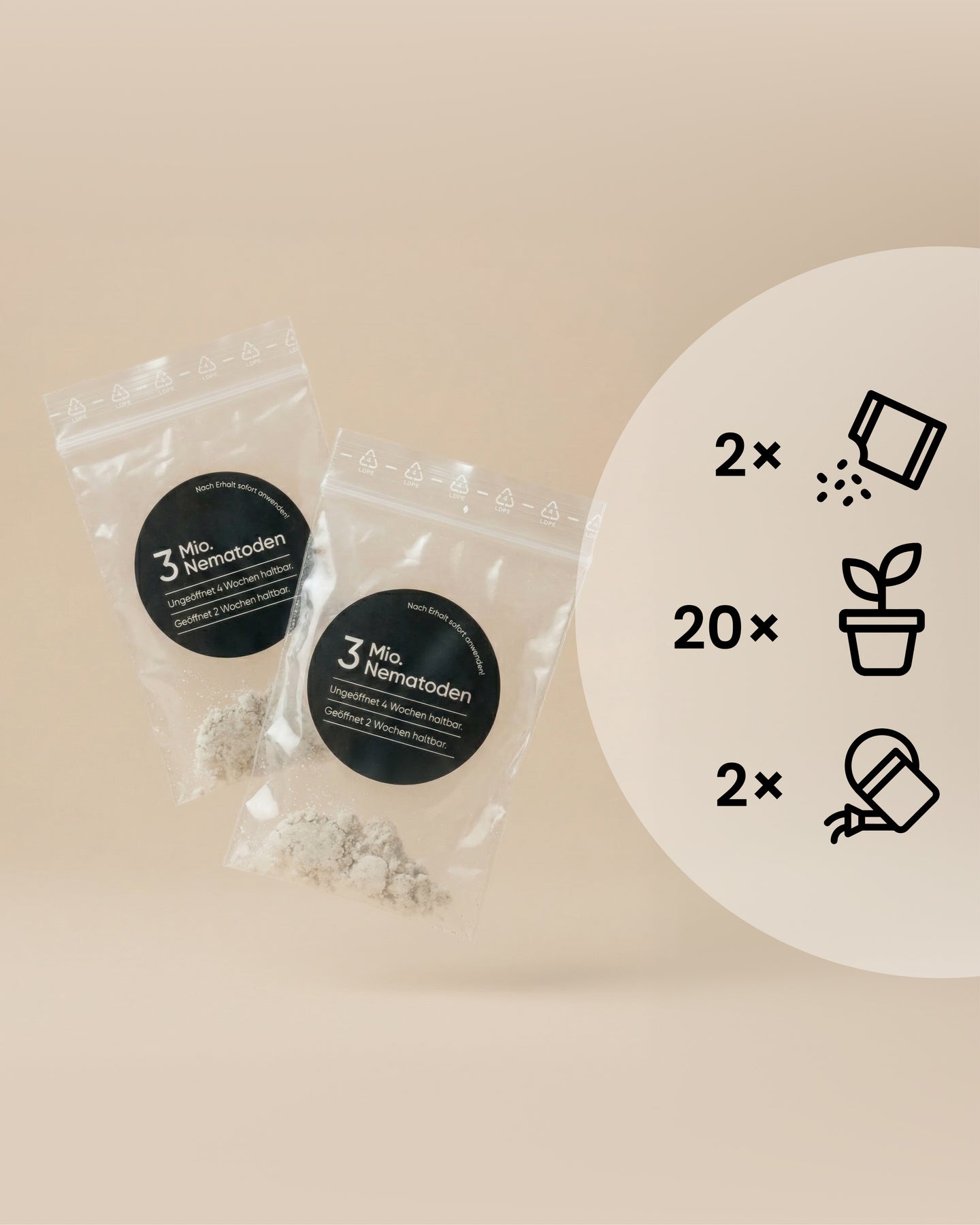 Zwei durchsichtige Beutel mit der Aufschrift "Nematoden gegen Trauermücken" mit Pulver sind auf Beige abgebildet. Die Icons auf der rechten Seite zeigen: 2 Päckchen, 20 Zimmerpflanzen und 2 Gießkannen - ideal für die Bekämpfung von Trauermücken bei Zimmerpflanzen.