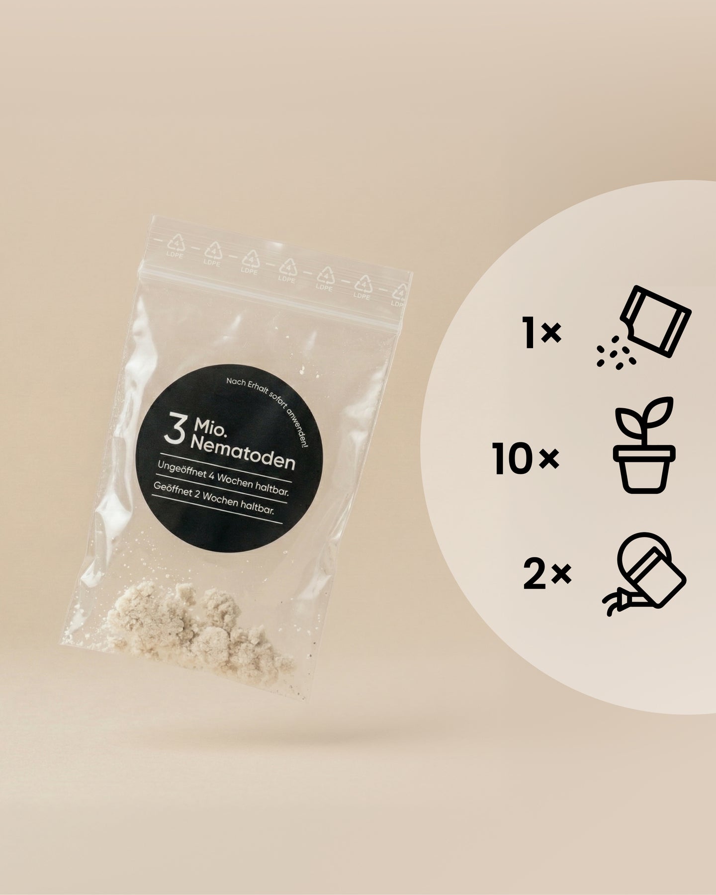 Ein durchsichtiger Beutel mit der Aufschrift "3 Mio. Nematoden" mit weißem Pulver zur Bekämpfung von Trauermücken in Zimmerpflanzen ist links abgebildet. Rechts: Piktogramme für 1 Päckchen, 10 Pflanzentöpfe und 2 Gießkannen. Produkt: Nematoden gegen Trauermücken. Beigefarbener Hintergrund.