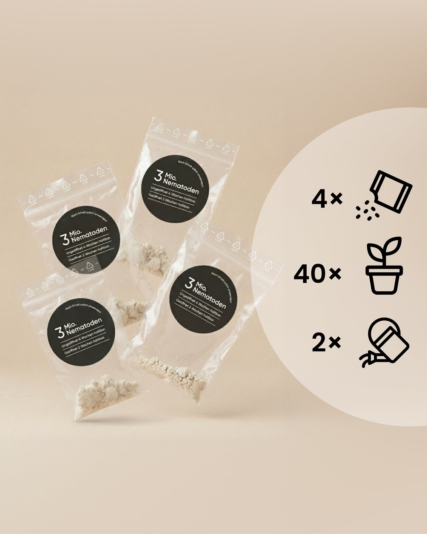 Drei durchsichtige Beutel mit schwarzen Etiketten von Nematoden gegen Trauermücken-Pulver sind auf einem beigen Hintergrund abgebildet. Auf der rechten Seite sind Icons zu sehen: 4 Saatgutpakete, 40 Zimmerpflanzen und 2 Gießkannen - ideal für die Bekämpfung von Trauermücken.