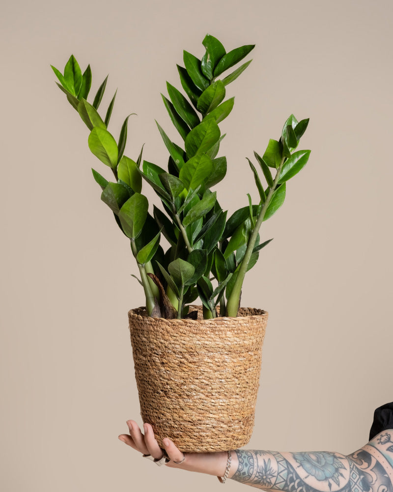 Eine tätowierte Hand hält ein gewebtes Pflanzenkorb-Set aus Seegras (Kesat | 2 × 18) mit einer üppig grünen ZZ-Pflanze vor einem schlichten beigen Hintergrund.