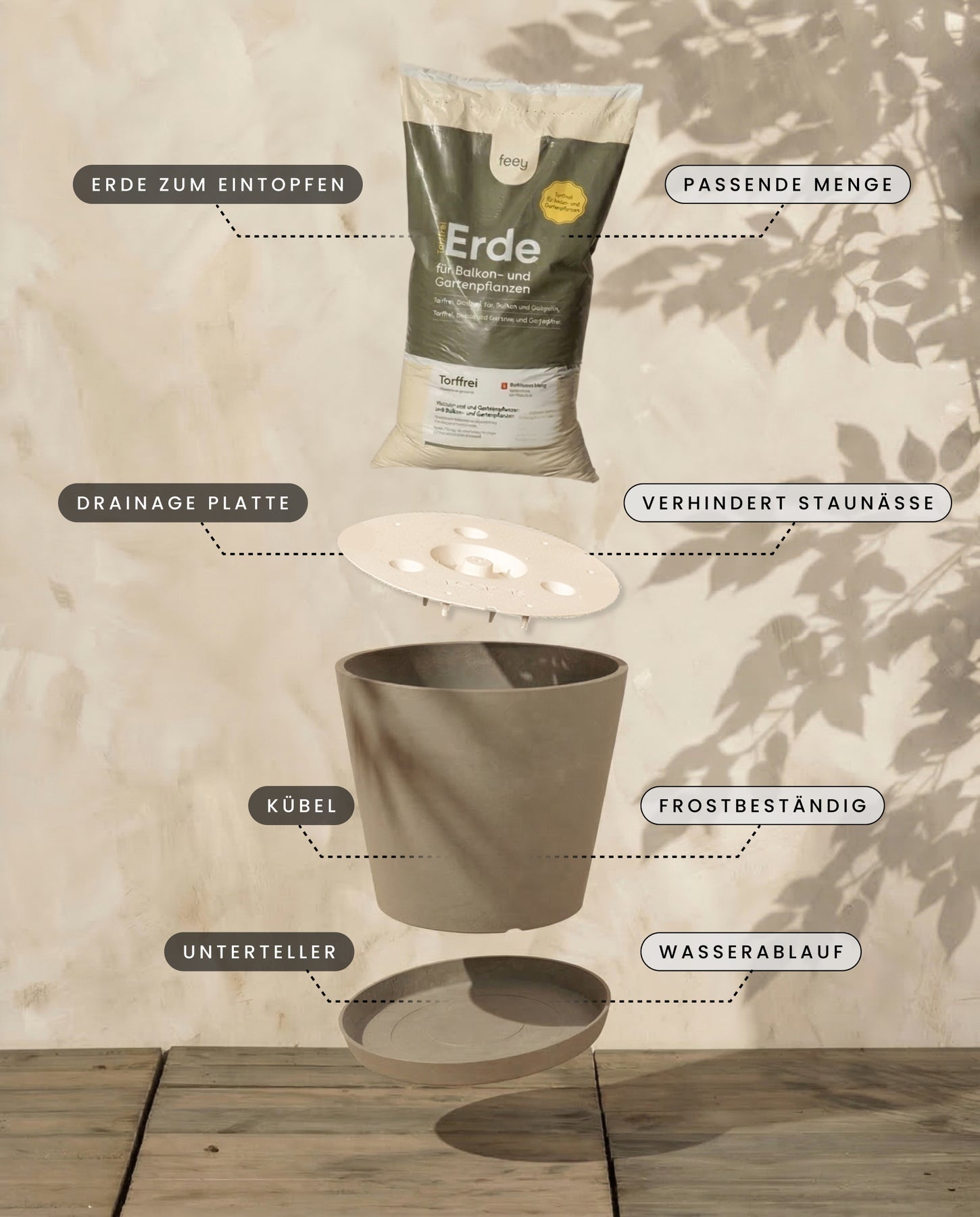 Wenn du diese Töpfe in Kombination mit Pflanzen kaufst, legen wir deiner Bestellung automatisch die passende Menge Erde (32 L) für Balkon- & Gartenpflanzen bei. 🥰