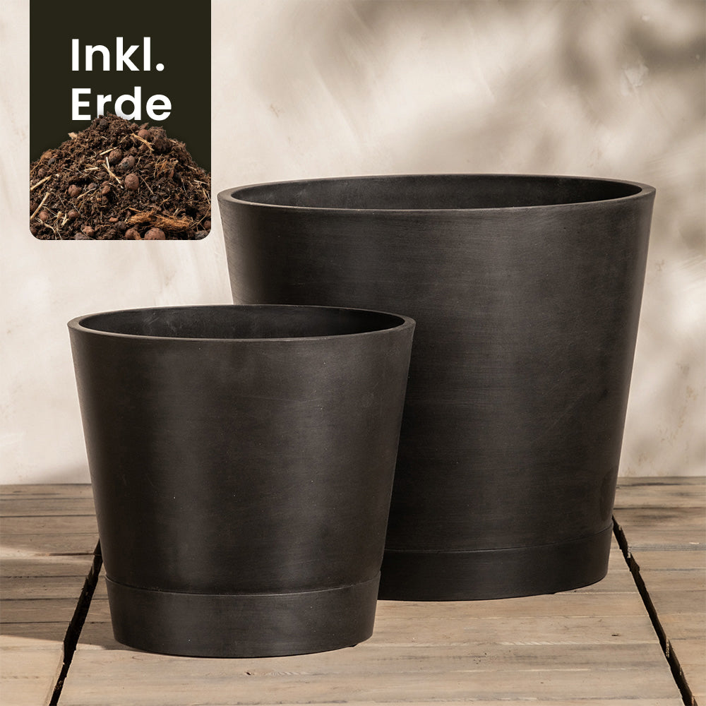 Das Pflanzkübel-Set Venice (40, 30) in modernem Schwarz steht auf Holz und eignet sich perfekt für die Terrasse. Ein kleines Bild oben links weist darauf hin, dass die Blumenerde inklusive ist.