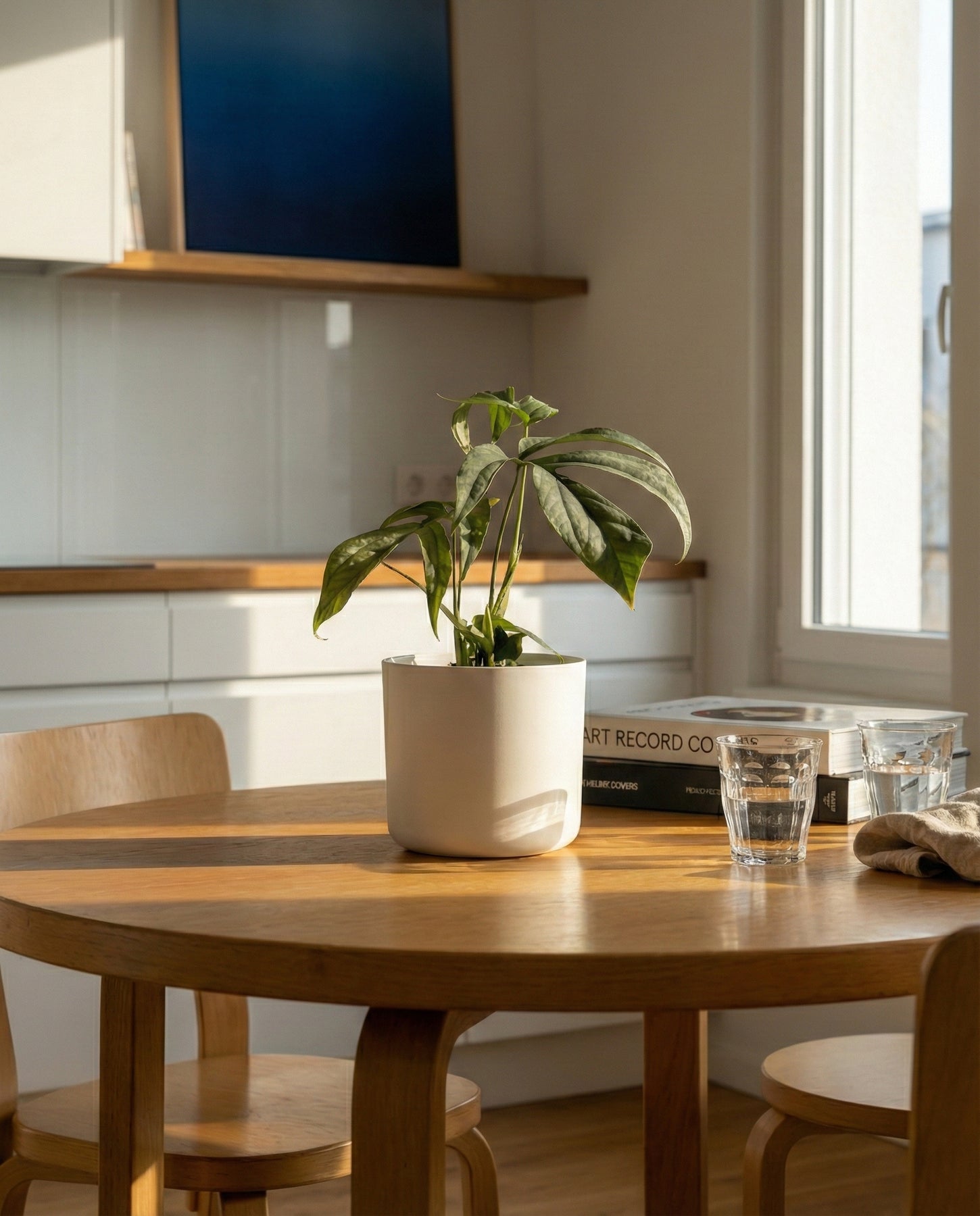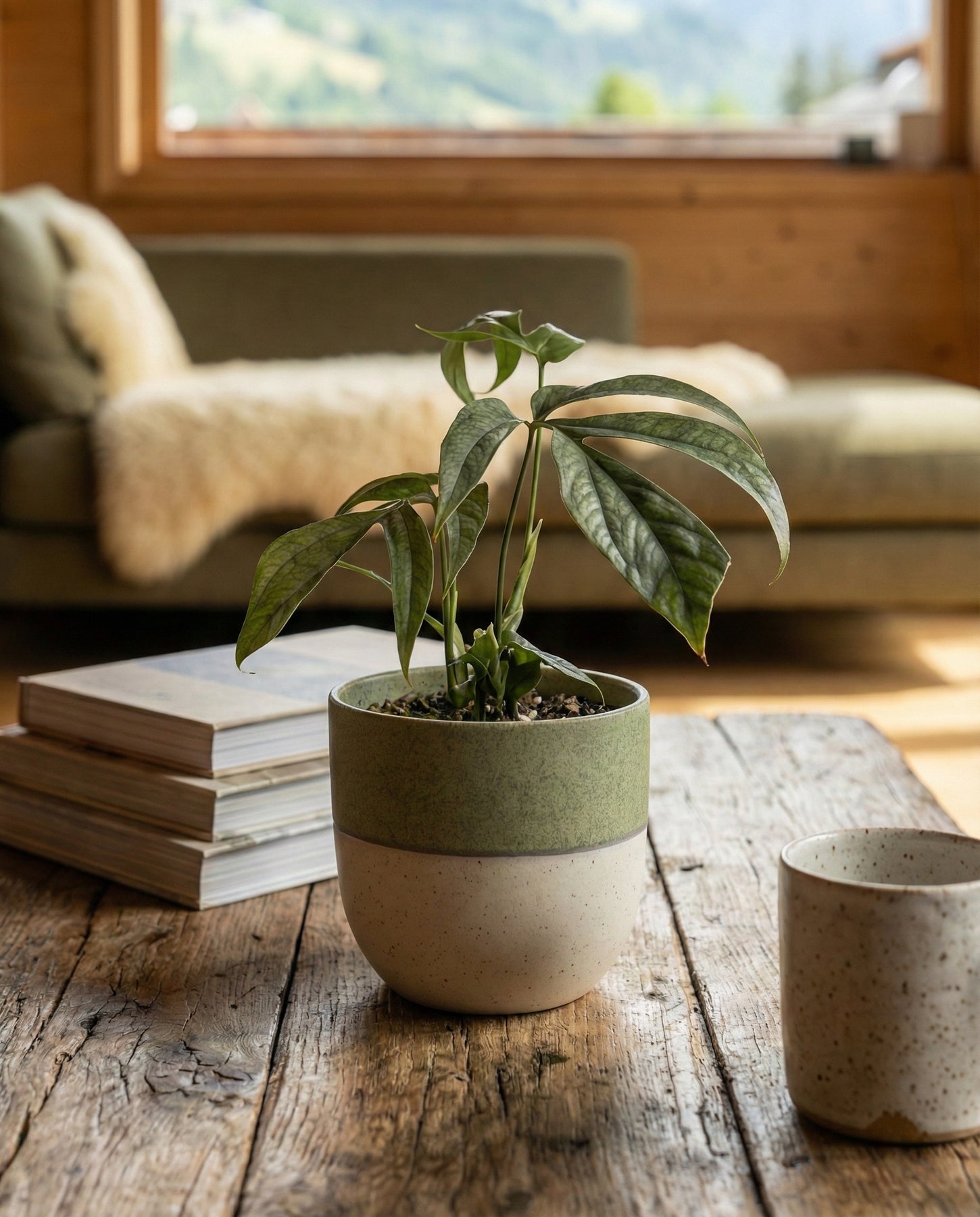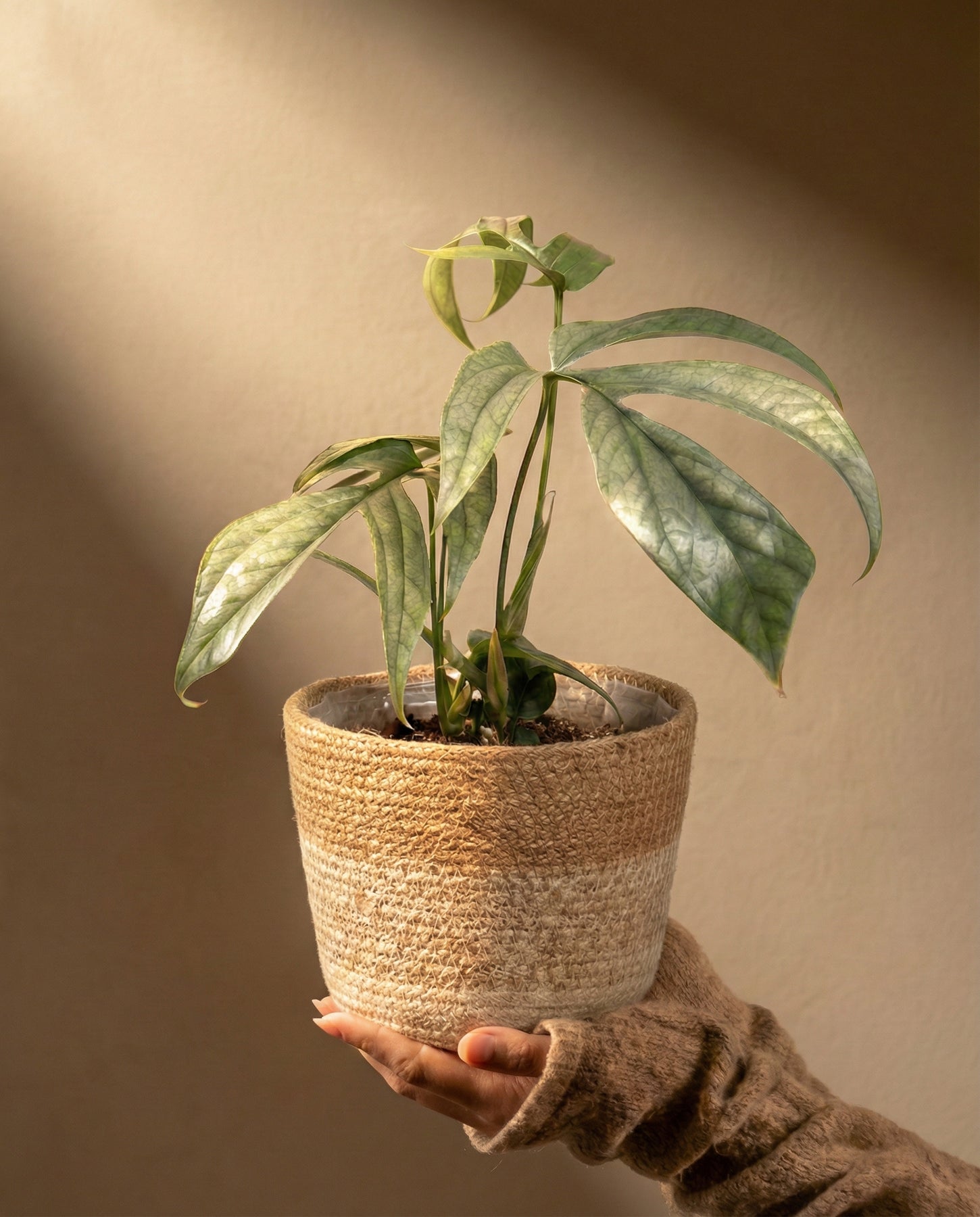 Die Amydrium medium ’Silver' steht am liebsten an einem hellen Plätzchen ohne direkte Sonne. Sie kommt aber auch an einem halbschattigen Ort zurecht.