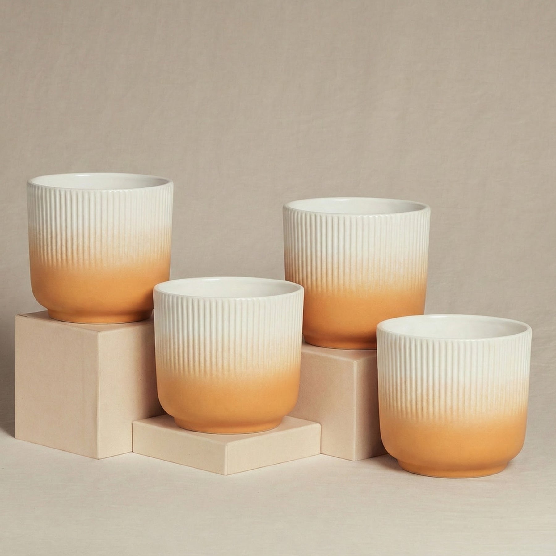 Nahaufnahme des Keramik-Topfsets "Rilio" (4 × 14): Keramiktopf mit vertikalen Rillen, einer glatten, matten Oberfläche und einem sanften Farbverlauf von Weiß am oberen Rand zu Orange am unteren Rand.