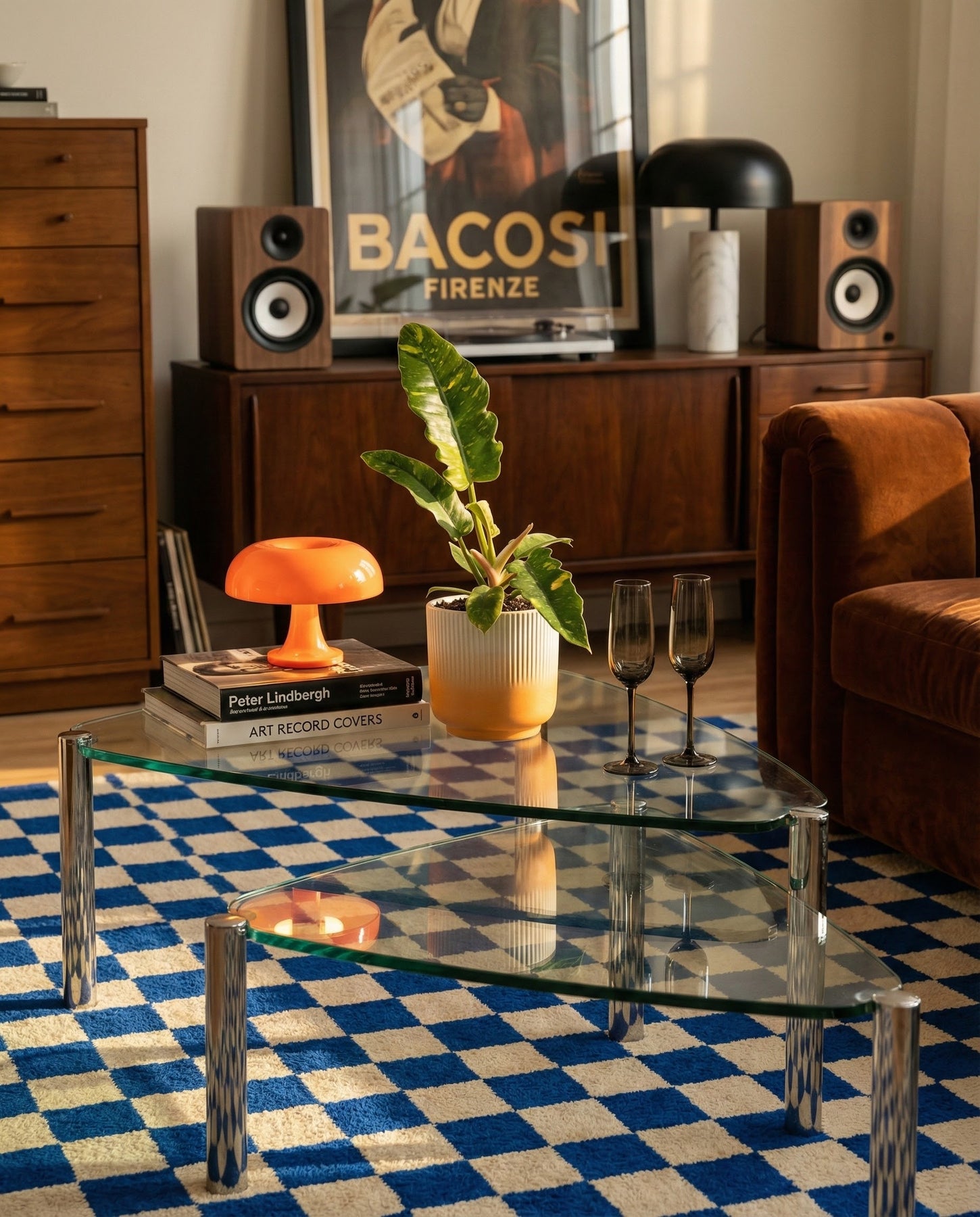 Ein stilvolles Wohnzimmer mit einem Couchtisch aus Glas, einer Zimmerpflanze aus dem Keramik Topfset &
